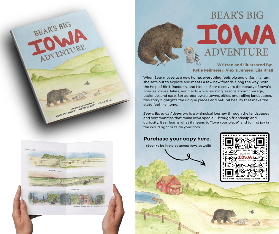 When Bear moves to a new home, everything feels big and unfamiliar until she sets out to explore and meets a few new friends along the way. With the help of Bird, Raccoon, and Mouse, Bear discovers the beauty of Iowa’s prairies, caves, lakes, and fields while learning lessons about courage, patience, and care. Set across Iowa’s towns, cities, and rolling landscapes, this story highlights the unique places and natural beauty that make the state feel like home. Bear’s Big Iowa Adventure is a whimsical journey through the landscapes and communities that make Iowa special. Through friendship and curiosity, Bear learns what it means to “love your place” and to find joy in the world right outside your door.