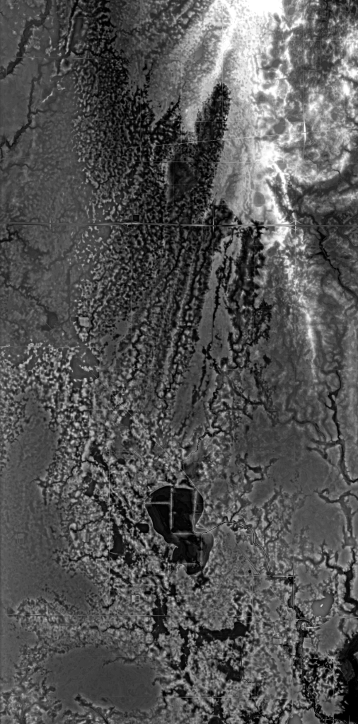 These visualizations aim to digitally reconstruct the historical ecologies of the Lake Cairo watershed, known as Drainage District No. 71. By blending organic and linear shapes, they reveal the interplay between the natural ecosystem and human-made infrastructure. The process involves using bare-earth LiDAR digital elevation models (DEMs or digital terrain models, DTMs), which are converted to relative elevation models (REMs) in QGIS. These REMs make it easier to visualize the watershed’s transformation over time, changes that are often hidden due to the landscape’s drastic alteration into farm fields. Through these visualizations, the story of Lake Cairo and its watershed is brought to life in a way that can no longer be seen on the ground.8